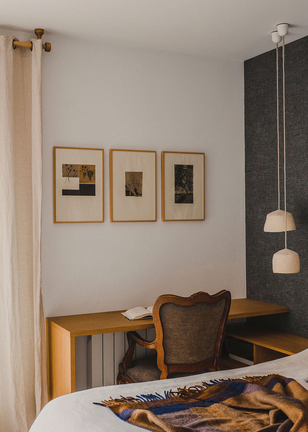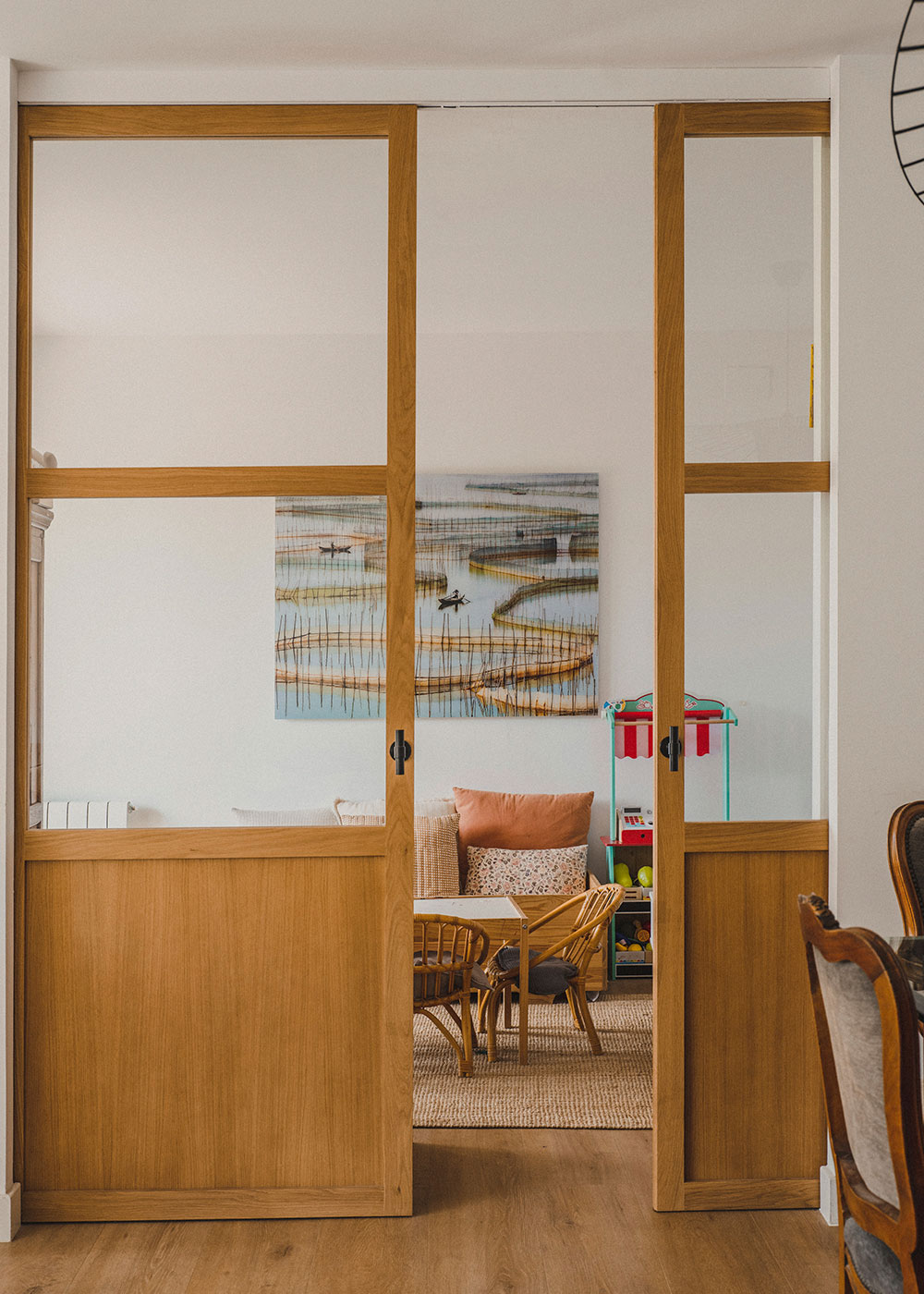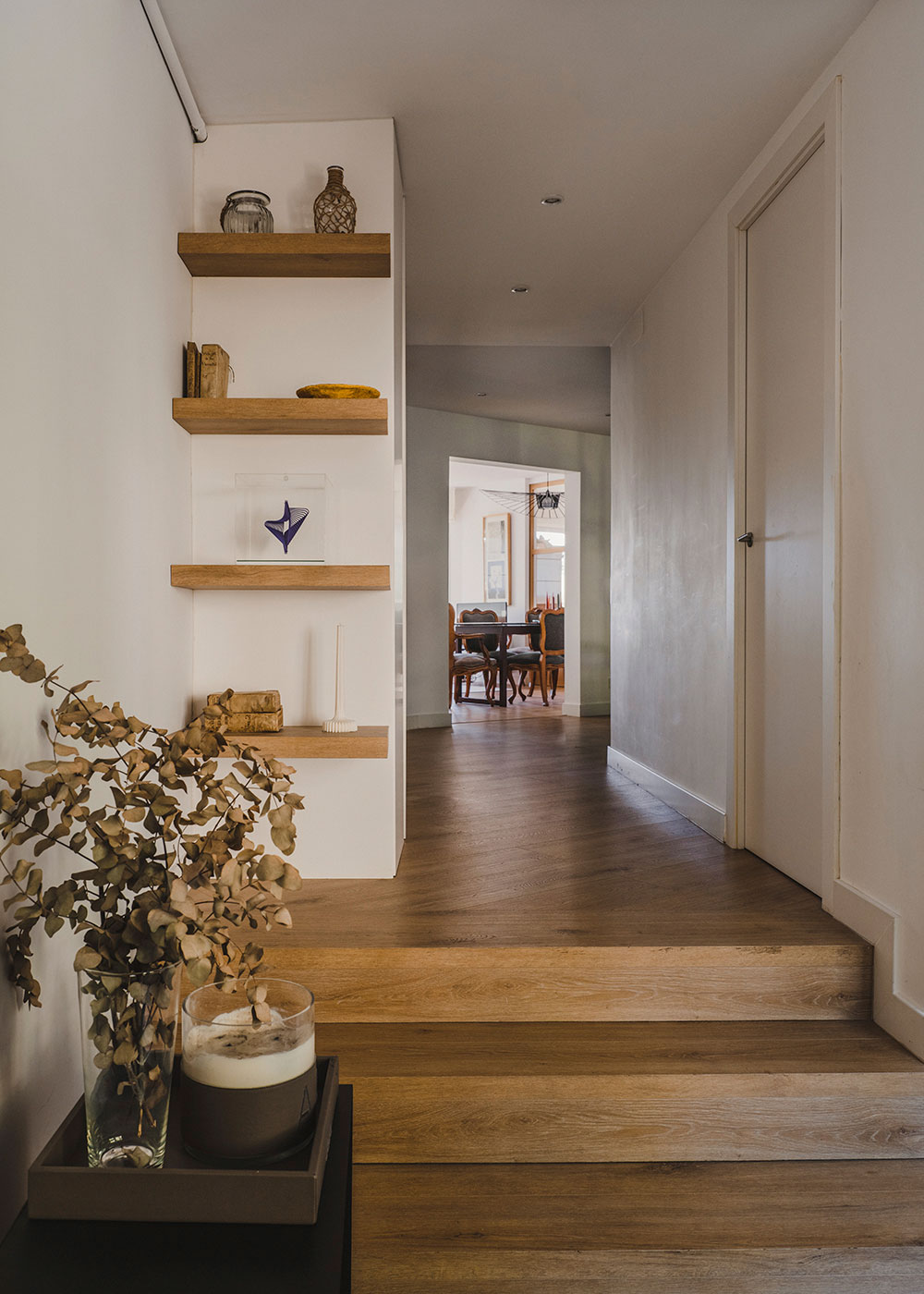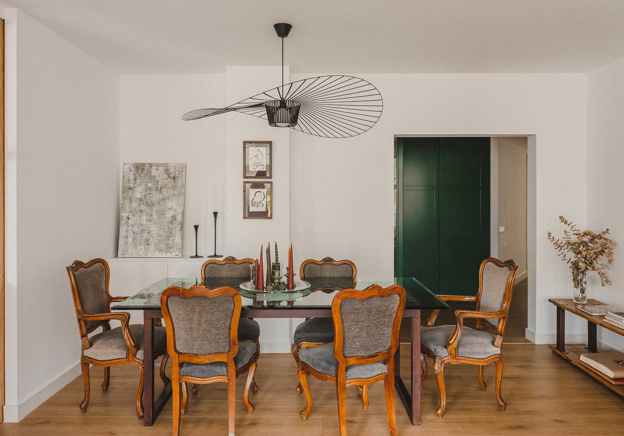 El mobiliario del apartamento es una mezcla cuidadosamente curada de piezas antiguas familiares y elementos de diseño contemporáneo. Las piezas antiguas añaden un sentido de historia y personalidad al espacio, mientras que los muebles modernos introducen líneas limpias y una funcionalidad adaptada a las necesidades actuales. Esta combinación crea un ambiente acogedor y sofisticado que refleja el estilo único de la familia.