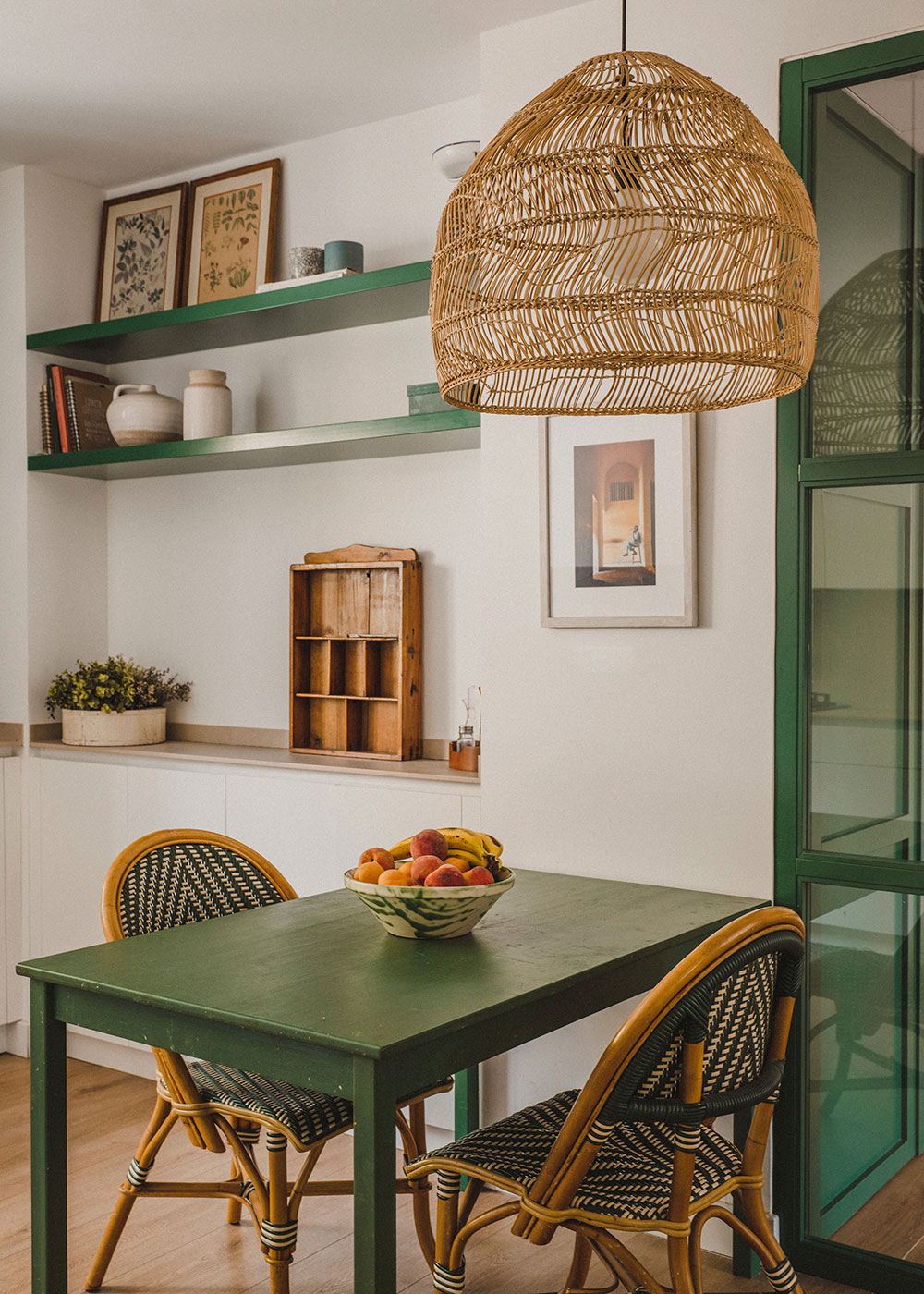 La elección de materiales fue fundamental en este proyecto. La madera, utilizada en los pavimentos, aporta calidez y un toque natural que contrasta armoniosamente con los detalles en verde. Estos detalles verdes son visibles en elementos como la estructura del cerramiento de la cocina, que crea una transición visual con la vegetación exterior cuidadosamente seleccionada para complementar el salón. Este uso estratégico del color verde no solo aporta frescura, sino que también establece una conexión visual con el entorno natural circundante.
